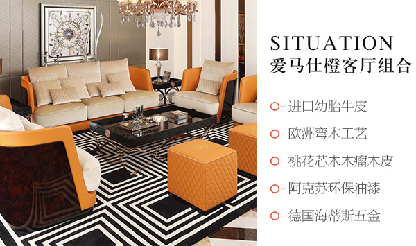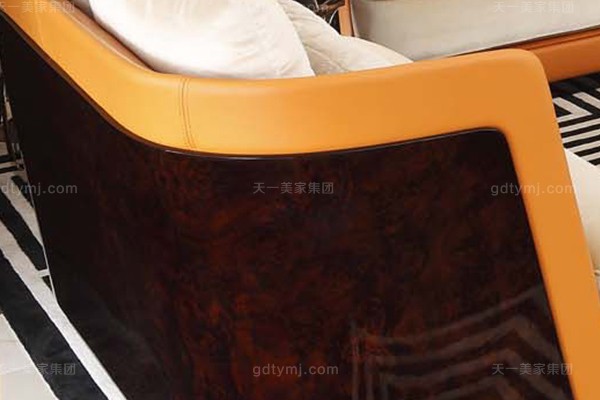 高端后現代輕奢客廳家具橙色皮桃木紋飾板真皮沙發組合