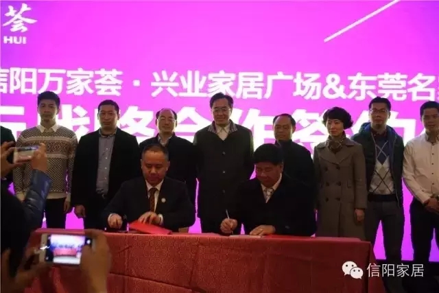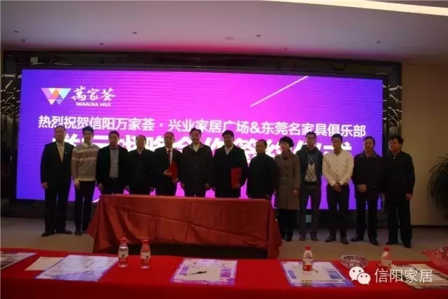 活動期間,在信陽市相關領導和東莞名家具俱樂部理事長尹成枝、青年企業家委員會會長林國榮、東莞市家具協會會長陳建京及廣東天一美家家居集團有限公司董事長、信陽市家具協會會長程一,信陽市家具協會執行會長、萬家薈興業家居廣場執行總裁花少建等的見證下,萬家薈興業家居廣場與東莞名家具俱樂部舉行了隆重的戰略合作簽約儀式。此舉標志著萬家薈全球招商戰略已結出豐碩成果,成為本次活動的最大亮點。