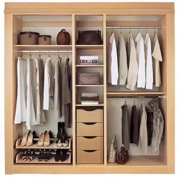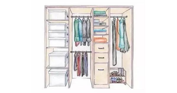 通常衣柜的設(shè)計(jì)是這樣,有百寶格、有被褥區(qū),有上衣區(qū)、長(zhǎng)衣區(qū),還有疊放區(qū)和抽屜。